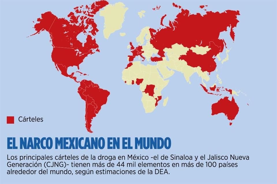 Los principales cárteles del narcotráfico mexicano -el Cártel de Sinaloa y el Cártel Jalisco Nueva Generación (CJNG)- tienen más de 44 mil elementos en más de 100 países alrededor del mundo, estimó hoy la Administración para el Control de Drogas de Estados Unidos (DEA).