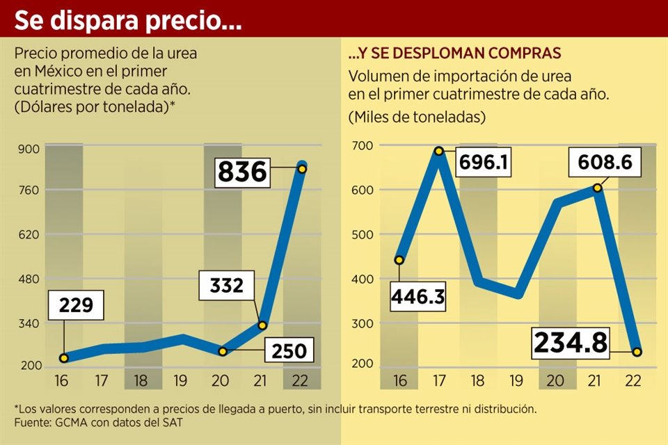 Entre enero y abril pasados, las importaciones de urea -el fertilizante de mayor uso en México- se desplomaron 61.4 por ciento anual, a su nivel más bajo para un primer cuatrimestre desde el 2016, revelan cifras de Grupo Consultor de Mercados Agrícolas (GCMA), con base en datos del SAT.