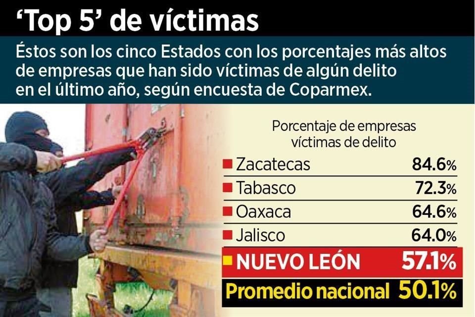 El crimen puso a Nuevo León en el "Top 5" de los Estados con mayor proporción de empresarios que han sido víctima de delitos en sus negocios en el último año.