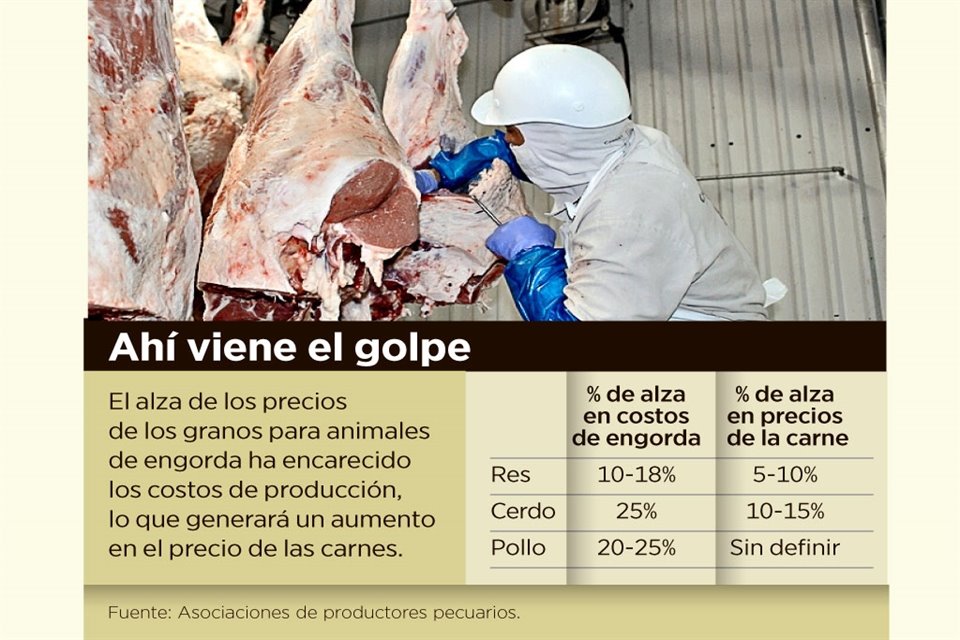 Antes de finalizar el año, la carne de res, cerdo y pollo en el País subirán hasta 15 por ciento por el fuerte aumento en los precios mundiales de los granos, anticiparon la Asociación de Engordadores de Ganado Bovino del Noreste (AEGBN), la Organización de Porcicultores Mexicanos (Opormex) y la Unión Nacional de Avicultores (UNA).