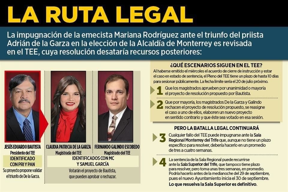 En el caso de la impugnación a la elección del municipio de Monterrey, que presentaron Mariana Rodríguez y su partido Movimiento Ciudadano (MC), el proyecto de resolución que se plantea en el Tribunal Electoral del Estado (TEE) propone validar el triunfo del priista Adrián de la Garza.