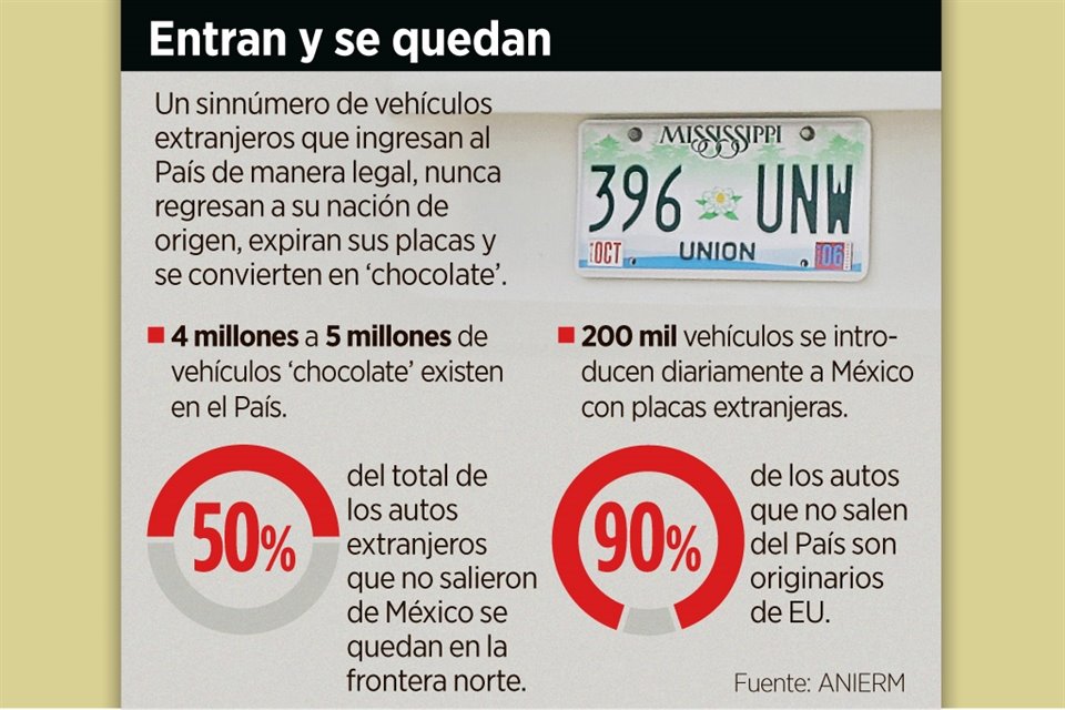 Para evitar la entrada masiva de autos extranjeros, que nunca salen de México y terminan convirtiéndose en "chocolate", la Asociación Nacional de Importadores y Exportadores de la República Mexicana (ANIERM) propondrá un plazo de retorno en la importación temporal de unidades por un año.