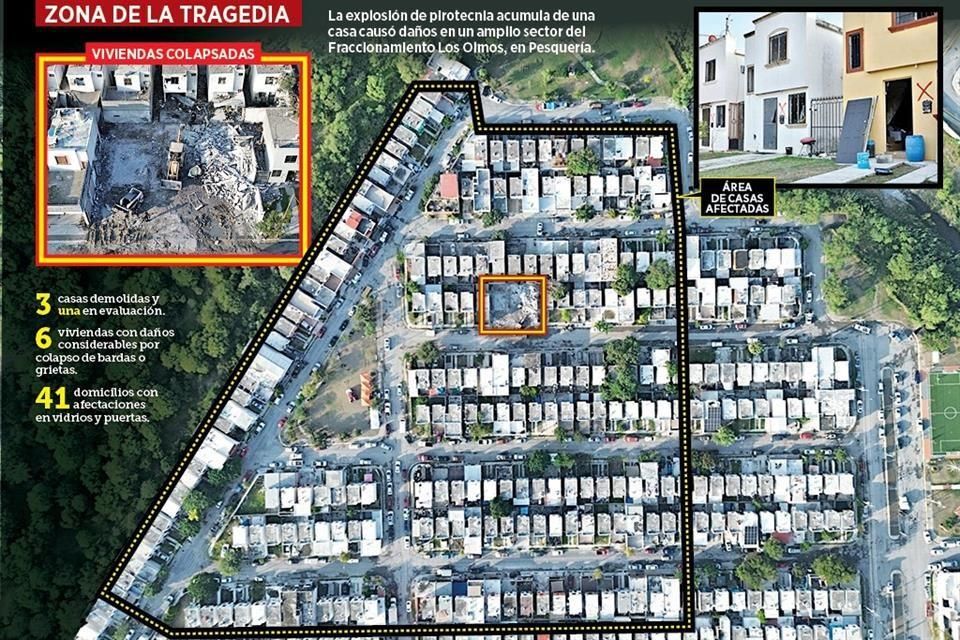 En 30 minutos, las explosiones e incendio por la pirotecnia almacenada en una casa del Fraccionamiento Los Olmos, en Pesquería, causaron daños al patrimonio que por años habían recabado decenas de familias.