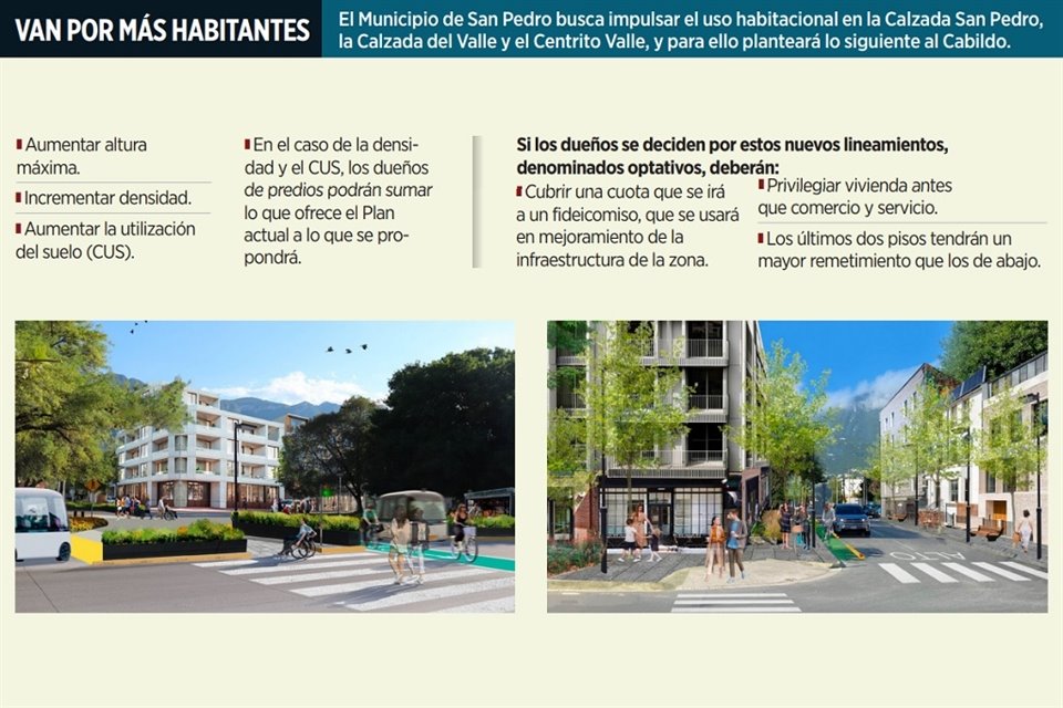 La propuesta del Municipio de San Pedro para incentivar el uso habitacional en las Calzadas y el Centrito será presentada hoy por el Instituto Municipal de Planeación y Gestión Urbana (Implang) a la Comisión de Ordenamiento y Desarrollo Urbano del Cabildo.