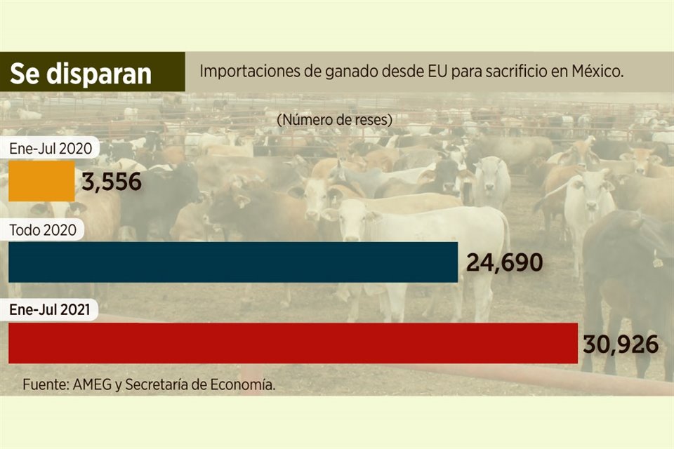 De enero a julio pasados, las empacadoras de Estados Unidos dispararon en 10 veces sus envíos de reses para sacrificio en México, debido a que allá no tienen suficientes trabajadores para hacerse cargo de ese proceso.