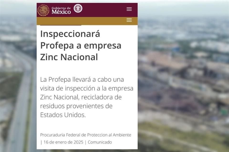 La Procuraduría Federal de Protección al Ambiente (Profepa) anunció que inspeccionará a la empresa Zinc Nacional, recicladora de residuos provenientes de Estados Unidos, luego de ser señalada en una investigación por emitir altas concentraciones tóxicas alrededor de su planta, en San Nicolás.