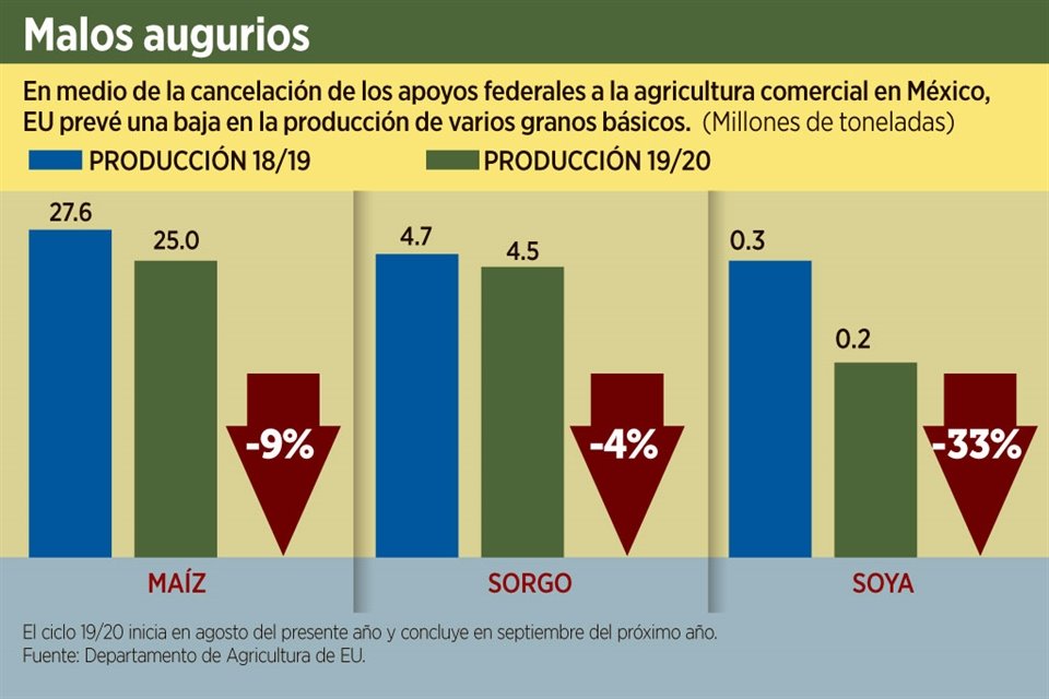 La producción de los principales granos básicos para consumo humano y forrajero en México comenzó a descender este año y seguirá en 2020, advierten las cifras del pronóstico de cosechas que hace el Departamento de Agricultura de Estados Unidos (USDA) para todo el mundo.