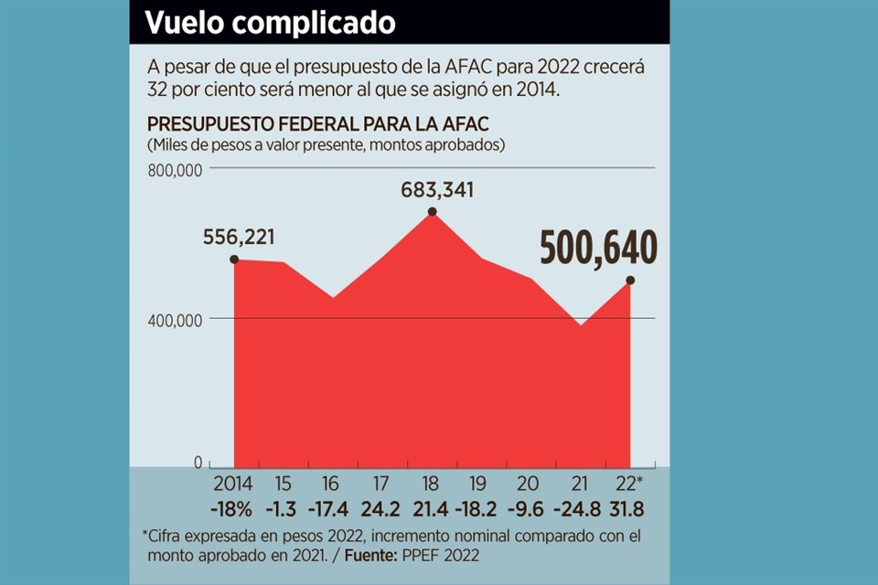 El Gobierno federal propuso destinar a la Agencia Federal de Aviación Civil (AFAC) 500 millones 640 mil pesos el próximo año, un alza de 31.8 por ciento respecto a 2021, según el Proyecto de Presupuesto 2022.