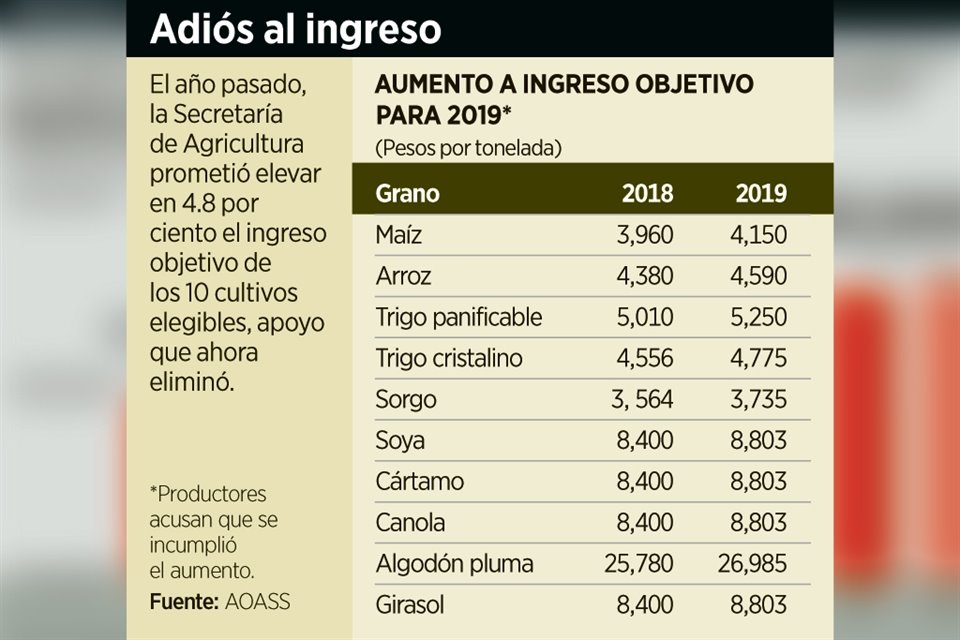 La Secretaría de Agricultura y Desarrollo Rural (Sader) eliminó el Programa de Apoyos a la Comercialización, con lo que desapareció el Ingreso Objetivo para productores de maíz, trigo panificable y cristalino, sorgo, soya, cártamo, canola, algodón pluma, arroz y girasol.