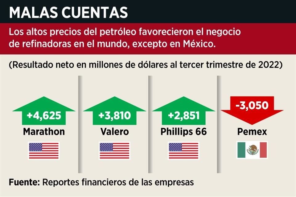 De enero a septiembre de 2022, Pemex Refinación perdió 223 millones de pesos cada 24 horas al refinar, es decir, un promedio de 9 millones de pesos cada hora.