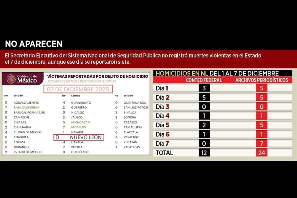 Aunque durante los primeros siete días de diciembre hubo 24 homicidios dolosos en Nuevo León, según archivos periodísticos, la autoridad federal reportó solamente 12 en los informes diarios del Secretariado Ejecutivo del Sistema Nacional de Seguridad Pública.