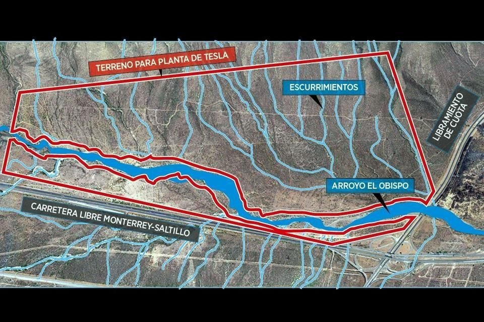 La Gigaplanta de Tesla en Santa Catarina tendrá el desafío de librar y no afectar el cauce del Arroyo El Obispo, que divide los dos polígonos del predio de 260 hectáreas donde se construirá la fábrica.