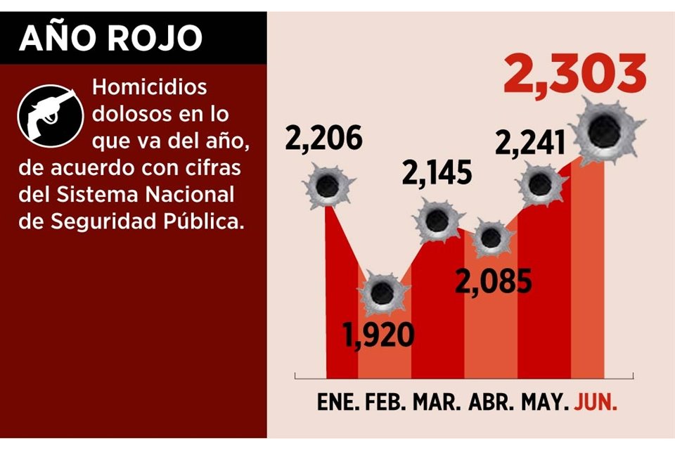 Junio se convirtió en el mes más violento del año, al acumular 2 mil 303 homicidios dolosos, de acuerdo con datos del Gabinete de Seguridad, y Nuevo León es el sexto Estado con más asesinatos.