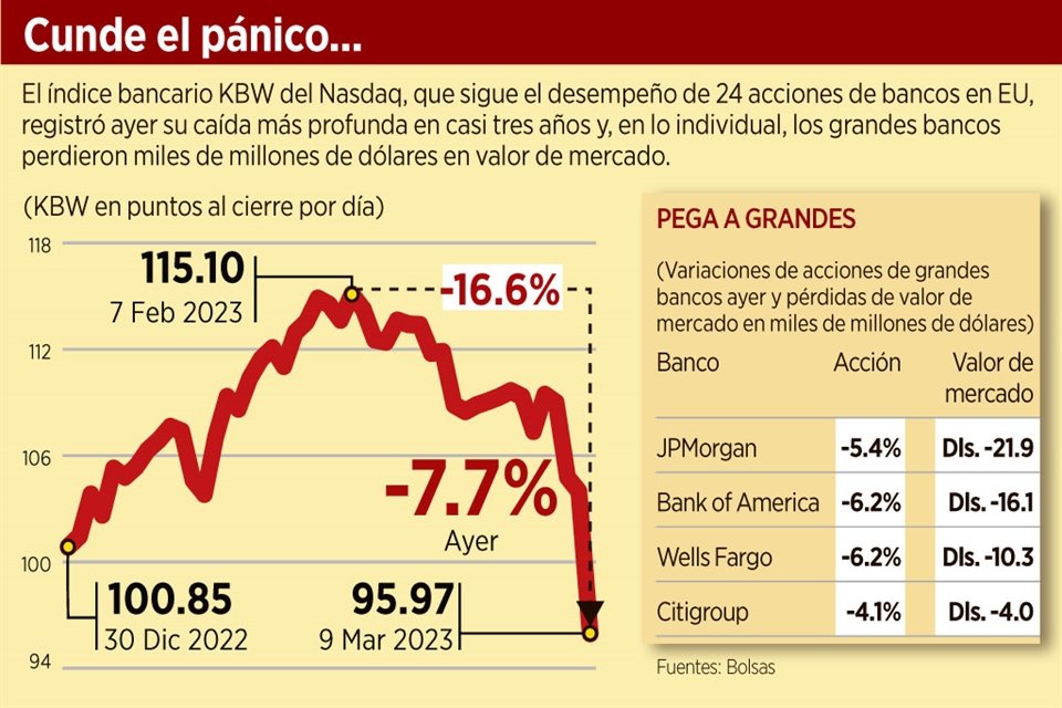 Las acciones de los bancos de Estados Unidos sufrieron ayer su peor caída en casi tres años, de acuerdo con un índice, ante crecientes preocupaciones sobre los daños que en sus finanzas les están causando los aumentos de las tasas de interés.