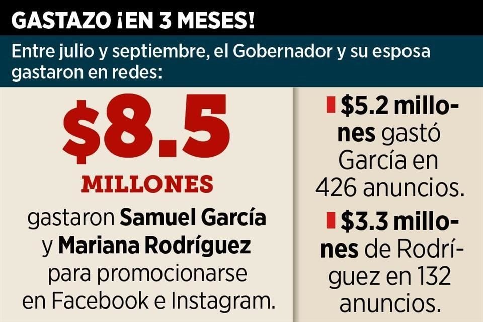 El matrimonio formado por el Gobernador Samuel García y Mariana Rodríguez, titular de la oficina estatal Amar a Nuevo León, gastó 8.5 millones de pesos en apenas tres meses para promocionarse tan sólo en las redes sociales Facebook e Instagram.