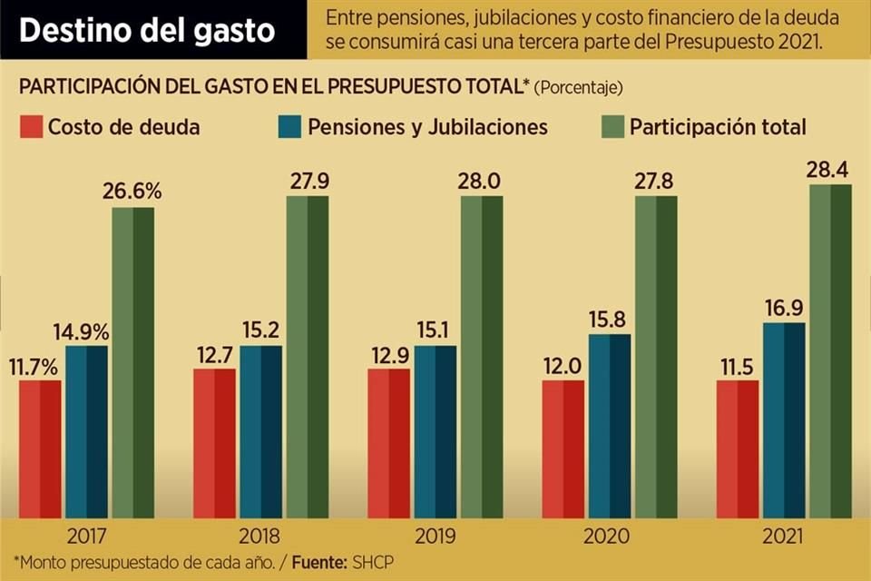 Entre pensiones, jubilaciones, intereses y comisiones por deuda, el Gobierno pagará un billón 724 mil millones de pesos, 28.4 por ciento del total del Presupuesto del próximo año.