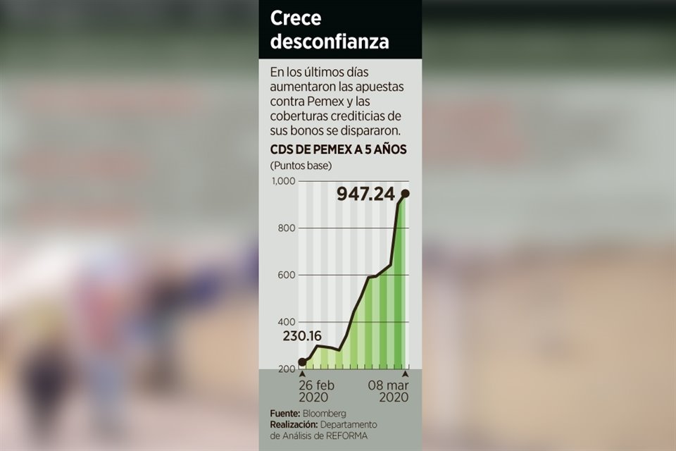 En el curso de un mes y medio, ante la caída de los precios del petróleo y la baja en las calificaciones de Petróleos Mexicanos (Pemex) por parte de Standard & Poor's (S&P) y Fitch Ratings, se cuadruplicó el costo de la cobertura crediticia de los bonos a 5 años de la petrolera del Estado.