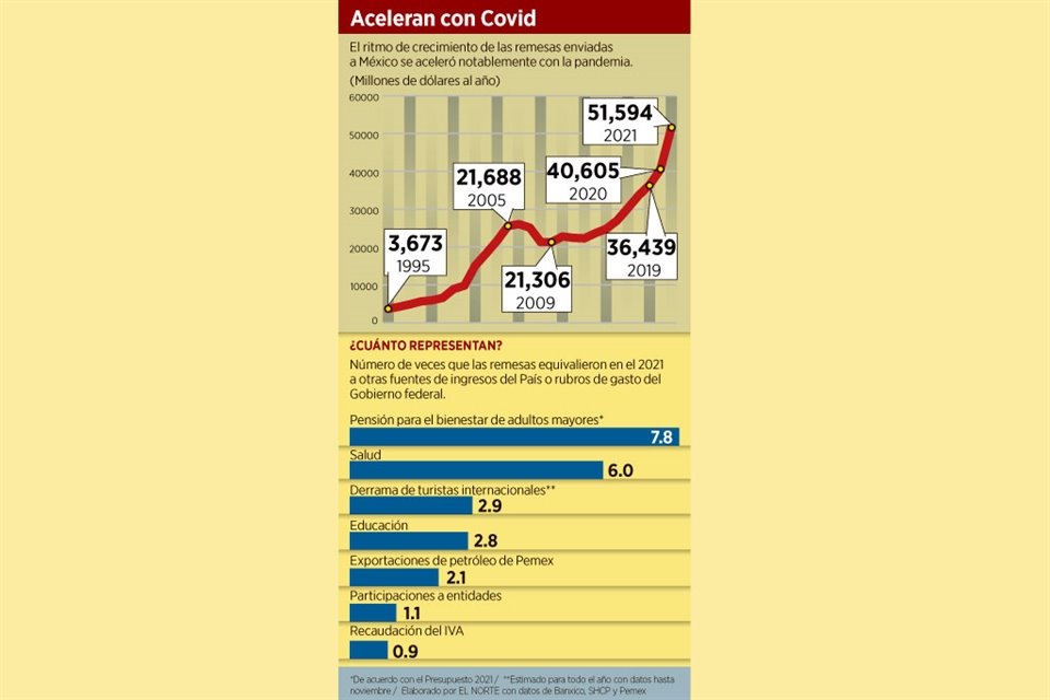 En todo el 2021, los ingresos por remesas recibidas en el País superaron por primera vez en un año los 50 mil millones de dólares, reportó ayer el Banco de México (Banxico).