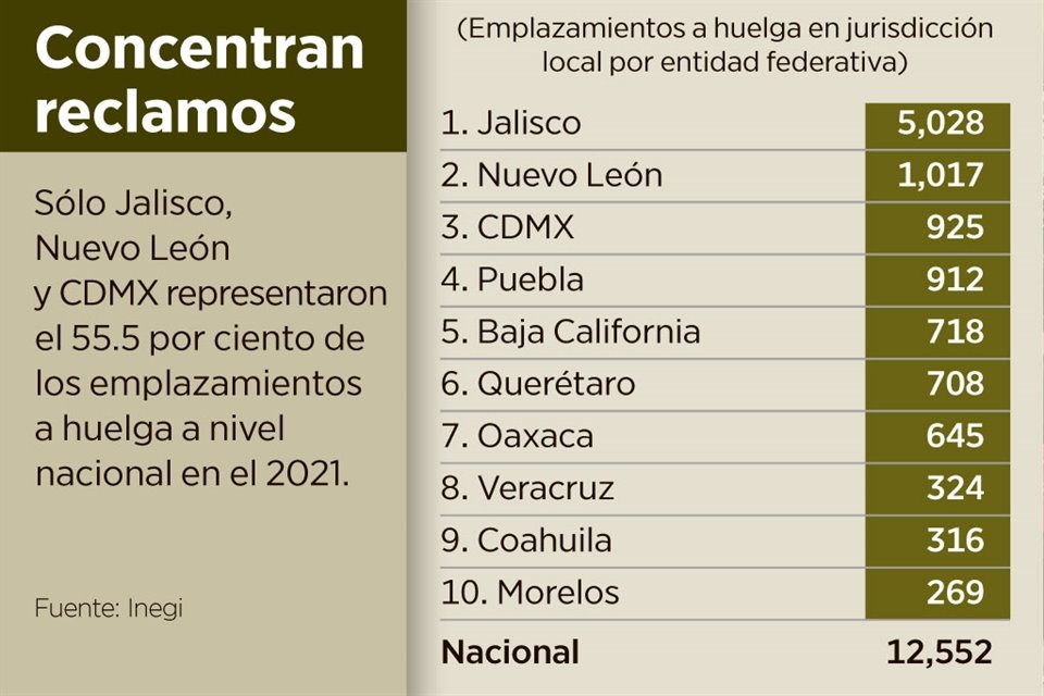 Durante el 2021, Nuevo León registró mil 17 emplazamientos a huelga en la jurisdicción local, ubicándose como la segunda entidad del País con el mayor número, reportó la semana pasada el Inegi.