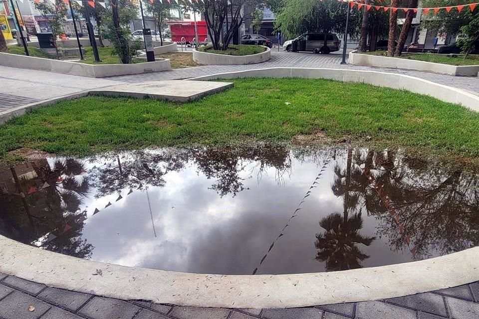 Un enorme charco de agua proveniente de las recientes lluvias inundó parte de la jardinera central del Parque Ciudadano, ubicado en la esquina de Escobedo y Matamoros.
