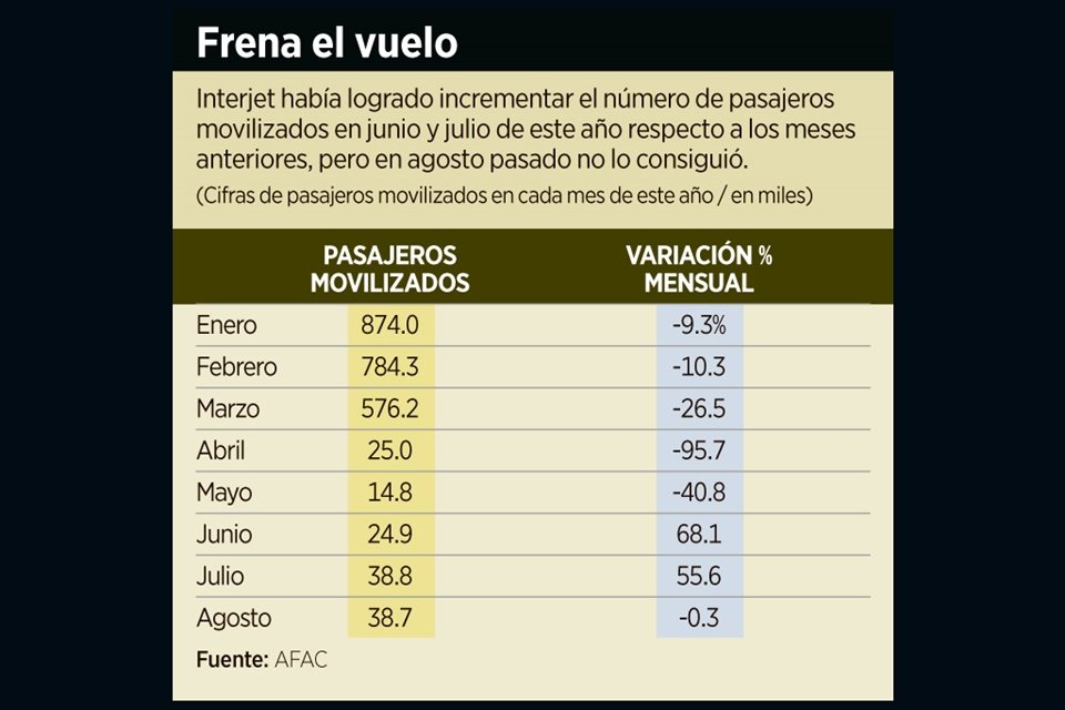 En agosto pasado, Interjet movilizó a 38 mil 737 pasajeros, prácticamente los mismos que en julio, pese a que operó más vuelos.
