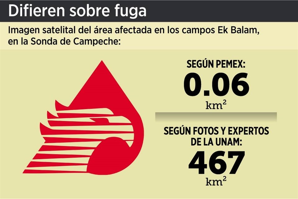 Aunque Pemex minimizó el derrame masivo de crudo reportado en los campos Ek Balam, en la Sonda de Campeche, y aseguró que estaba controlado, especialistas de la Universidad Nacional Autónoma de México (UNAM) alertaron ayer que la fuga se extiende en 467 kilómetros cuadrados.