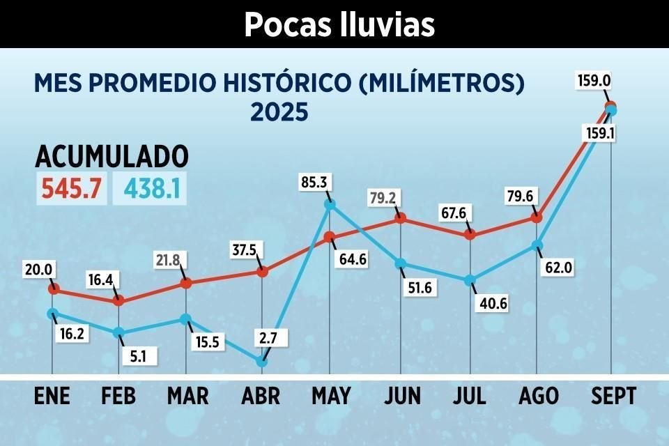 Aunque septiembre terminó por alcanzar su promedio histórico de lluvias en Nuevo León, en lo que va del 2025 las precipitaciones se mantienen un 20 por ciento por debajo de la media.