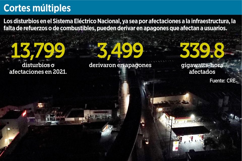 Los 13 mil 799 disturbios que se registraron en el Sistema Eléctrico Nacional (SEN) durante 2021 derivaron en 3 mil 499 apagones o interrupciones en el suministro eléctrico.