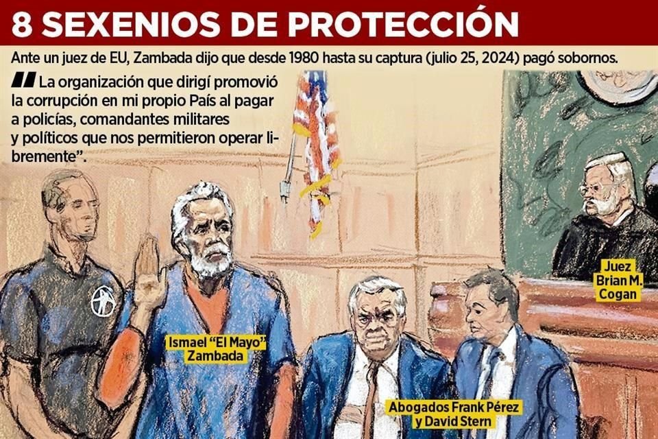 El legendario capo del Cártel de Sinaloa, Ismael "El Mayo" Zambada, se declaró ayer culpable de narcotráfico y lavado de dinero y reveló que desde hace 45 años, es decir a lo largo de ocho sexenios presidenciales, sobornó a mandos militares, policiales y políticos en México para poder operar con impunidad.