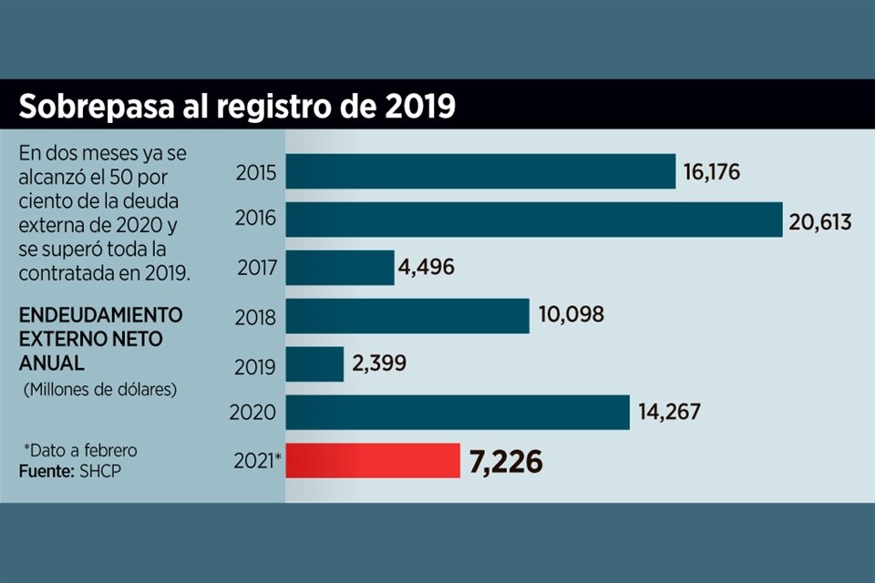 En los dos primeros meses del año, el Gobierno ha contratado deuda en el exterior por 7 mil 226 millones de dólares, 7.9 por ciento por arriba de lo aprobado para este tipo de deuda.