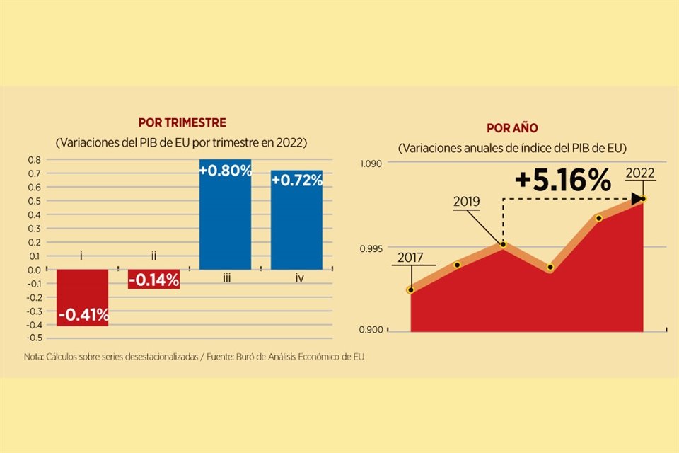 Pese a los temores de una recesión, durante el cuarto trimestre del 2022 el PIB de EU creció 0.72% respecto al previo, por arriba de 0.65% esperado por el consenso de los analistas.