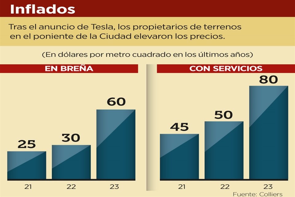 Todavía no inicia su construcción, pero tras el anuncio de la instalación de Tesla en Santa Catarina, los dueños de terrenos en breña en esa zona dispararon sus precios en 100 por ciento, señaló Sergio Reséndez, director regional de Colliers, firma global de bienes raíces industriales y comerciales.
