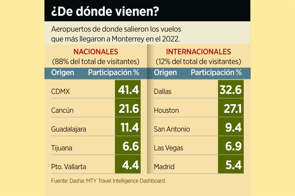 Durante el 2022, la derrama del sector turismo en Nuevo León ascendió a 15 mil 641 millones de pesos, lo que representó un incremento del 53 por ciento respecto al 2021, de acuerdo con un análisis de la plataforma Dasha: MTY Travel Intelligence Dashboard.