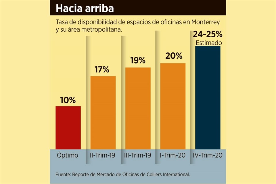 El cierre de negocios por la crisis provocada por el Covid-19 agravaría la disponibilidad de espacios de oficinas en Monterrey y su área metropolitana, la cual podría alcanzar un 25 por ciento al finalizar el año.