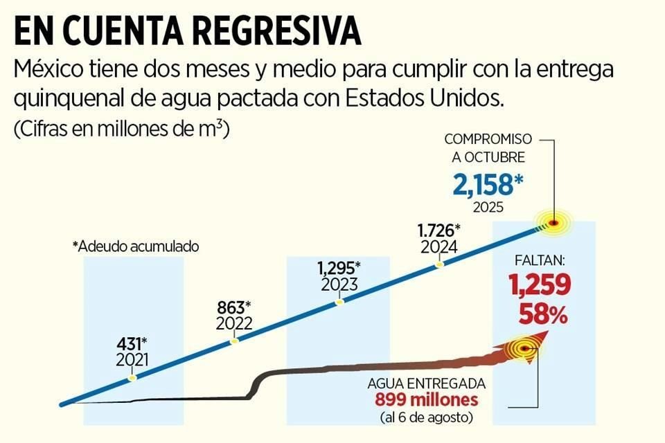 Con la sequía en el norte del País, a México sólo le quedan 78 días para que venza el plazo para cubrir los adeudos de entrega de agua que tiene con Estados Unidos, presión agravada por la amenaza del Gobierno de Donald Trump de imponer aranceles si hay incumplimientos.