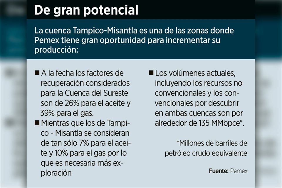 Para incrementar la producción de gas y crudo del País, será necesario que Pemex comience a invertir en la cuenca de Tampico-Misantla, además de continuar con el desarrollo de aguas profundas del Golfo de México.