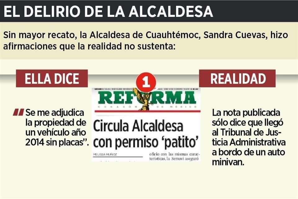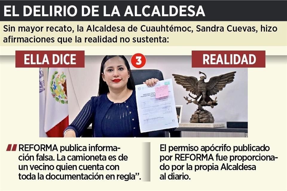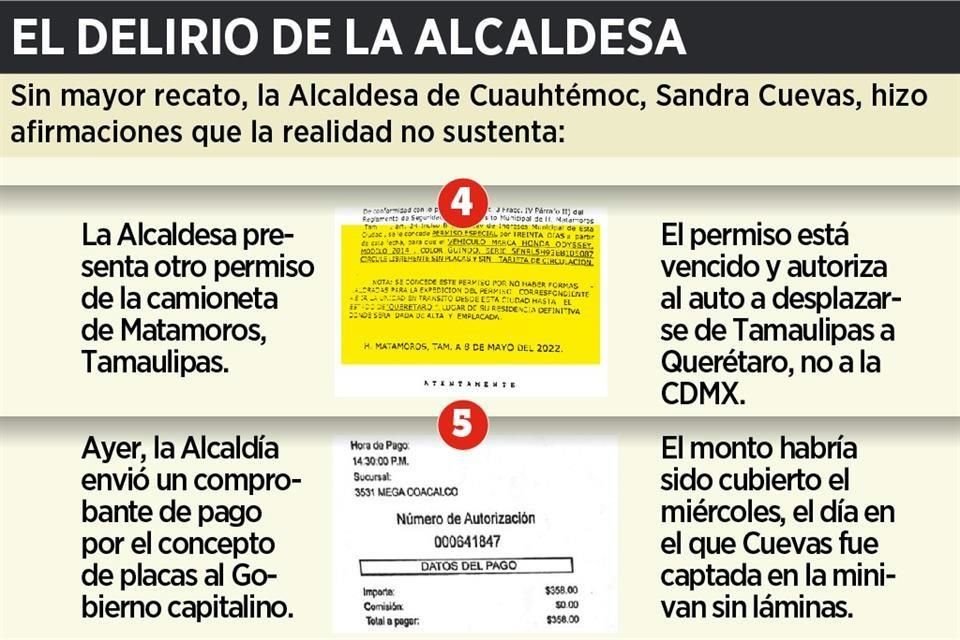 Para intentar justificar el uso de una camioneta sin placas y sin documentación autorizada, la Alcaldesa de Cuauhtémoc, Sandra Cuevas, ha presentado dos permisos, uno apócrifo y otro vencido, además de un pago de placas hecho en el Estado de México.