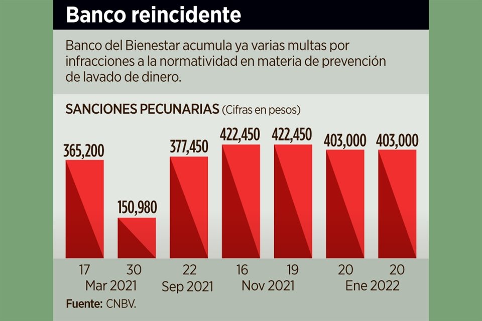 El Banco del Bienestar sumó otras dos multas de las autoridades regulatorias por incumplimientos a la legislación en materia de lavado de dinero.