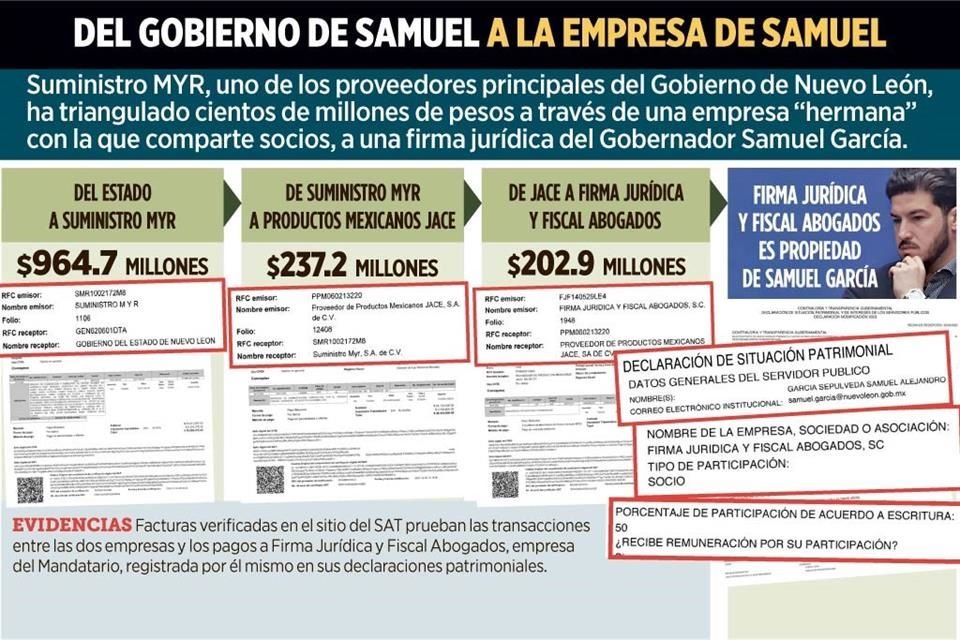 Uno de los proveedores más favorecidos con contratos por parte del Gobierno de Nuevo León ha triangulado, por medio de una compañía "hermana", al menos 202.9 millones de pesos a un despacho jurídico creado por el Gobernador Samuel García y su padre.