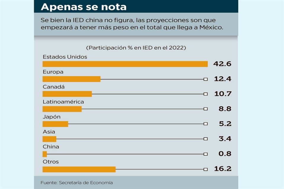 Si bien el monto de la Inversión Extranjera Directa (IED) procedente de China apenas refleja el 1 por ciento del total que llegó al País en el 2022, es la de mayor expansión en relación a otros países.