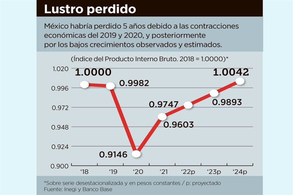 Luego de que el Inegi reportó ayer que el PIB subió apenas 5.0 por ciento real durante el 2021, analistas estimaron que, dadas las perspectivas de bajo crecimiento para el 2022 y los siguientes años, la economía mexicana tardaría hasta el 2024 en volver a su nivel más alto previo a la pandemia, registrado en el 2018.