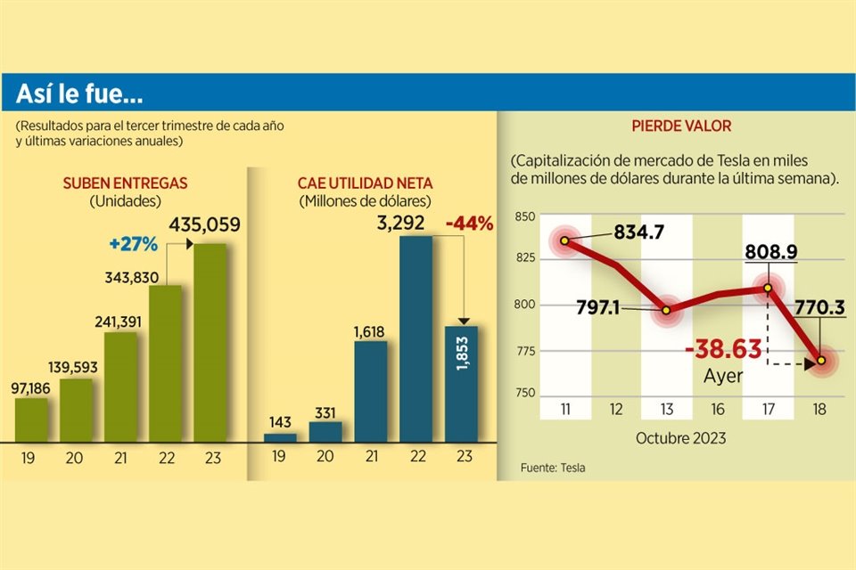 Durante el tercer trimestre del 2023, las entregas de vehículos de Tesla aumentaron 27 por ciento anual, pero su utilidad neta cayó 44 por ciento debido a que recortó los precios de sus unidades y asumió mayores costos para sus proyectos, como el de la Cybertruck que será lanzada ya el 30 de noviembre.