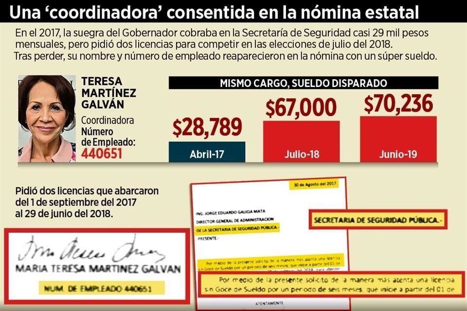 Después de su intento fallido por ganar la Alcaldía de Santa Catarina el año pasado, la suegra del Gobernador Jaime Rodríguez, María Teresa Martínez Galván, regresó en julio del 2018 -al menos en la nómina- a su mismo cargo como coordinadora en la Secretaría de Seguridad Pública estatal, pero con un sueldo más del doble que el anterior.